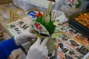 ミニ門松の製作では松さしから飾りつけまでコツコツと作業を行っています。(いばちゃん)